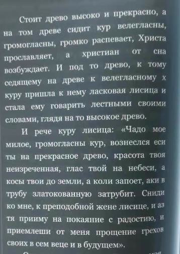 有一顆高高的大樹,枝繁葉茂,樹干挺直;這棵樹上棲息著一只公雞,它聲音洪亮,大聲啼叫,歌頌基督,把基督徒從睡夢(mèng)中喚醒。一只看上去溫文爾雅的狐貍來(lái)到大樹下面,她來(lái)見那只棲在樹上的大聲啼叫的公雞。狐貍兩眼望著那高高的大樹,開始對(duì)公雞阿諛?lè)畛小?/p>